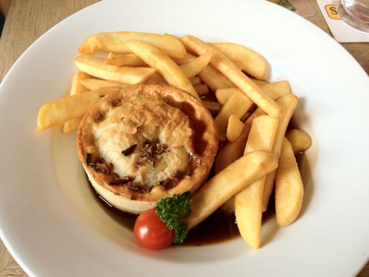 Z zakąsek tutejszych najlepsze było Raven Ale Pie - pasztecik, a w zasadzie kawał paszteta, z kruchego ciasta, zawierający wołowinę z cebulką i innymi sekretnymi ingrediencjami uduszone na mięciutko w lokalnym ale. Do tego sosik pod wiele mówiącą nazwą Guinness Gravy. I micha frytków. Tylko że tutejsza fryta to jest cały ziemniak pocięty wzdłuż na cztery albo osiem. Tutejszy ziemniak. A tutejszym ziemniakom nasze mogą mówić "proszę pana" ;D